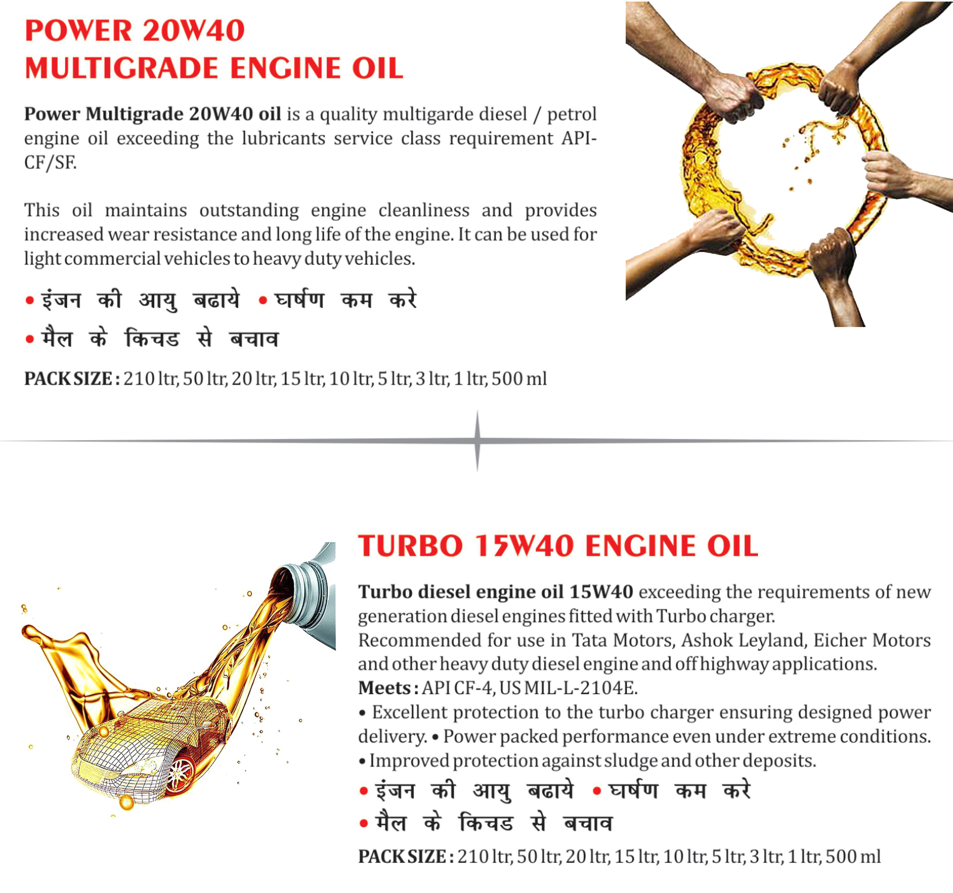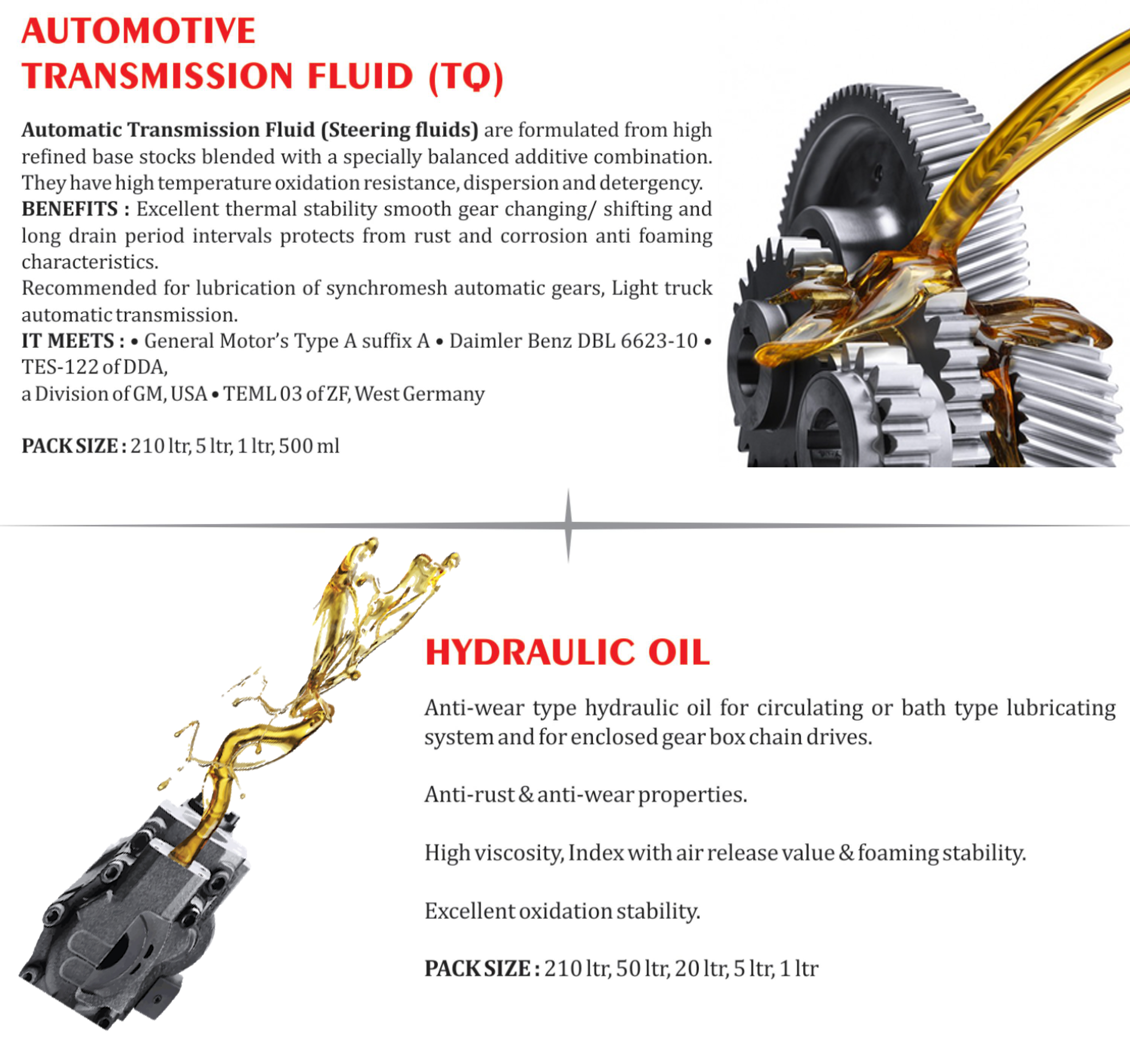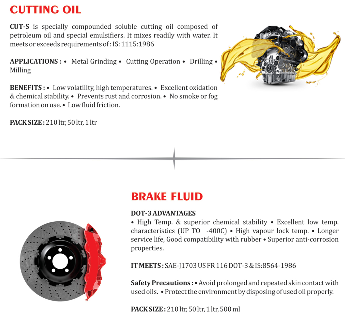 All Automotive Grade Oil, Industrial Oil, Gear Oil, Brake Fluid, Greases & Coolant.